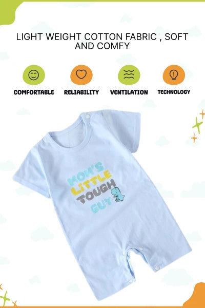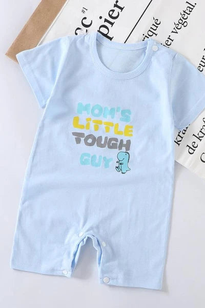 Love the "Mom's Little Tough Guy" saying! Soft blue is adorable. Easy snaps make changes simple