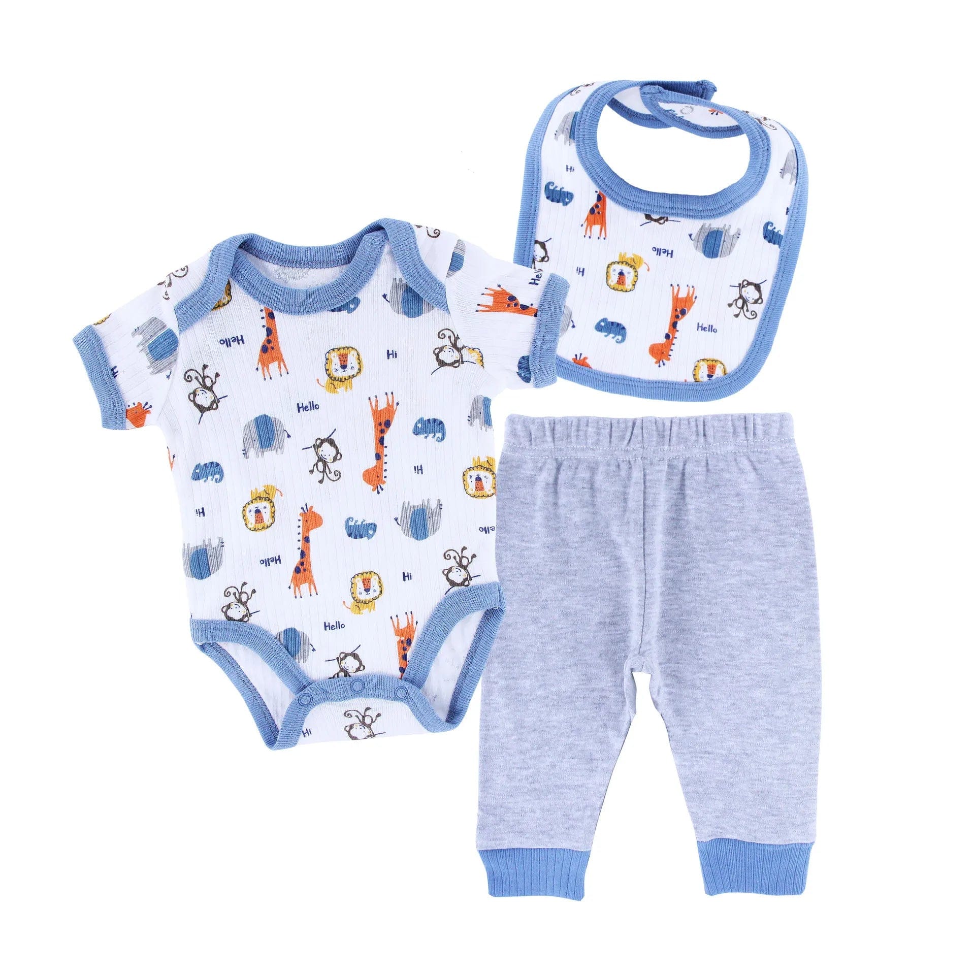 Includes a romper, pajama, and matching bib. Gentle cotton fabric, elastic fit, baby-safe stitching for everyday use.
